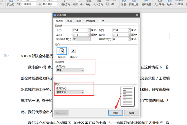 将“页码范围多页”设置成“普通”,点击“整篇文档”,最后点击“确定”,就完成设置A4格式了。