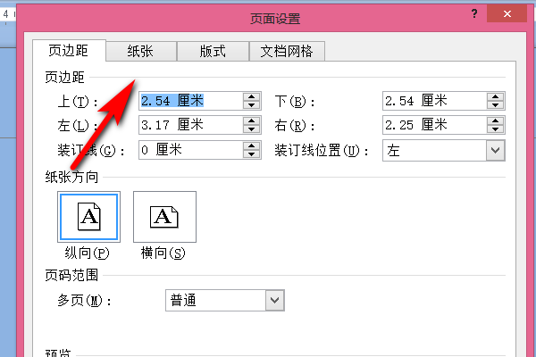 4、打开页面设置界面之后,可以看到有页边距,纸张版式和文档网格四个选项,点击纸张进入。