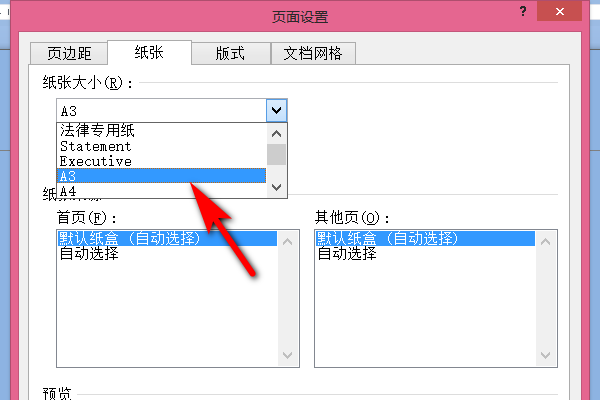5、然后在纸张的界面中,在纸张大小里面将纸张选择为A3,点击确定,这样就可以了。