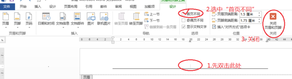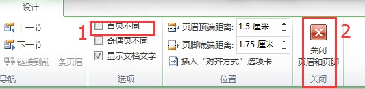 2、在【设计】的“选项”组中找到【首页不同】取消勾线->点击【关闭页眉和页脚。