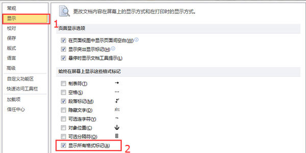 3、依次点【文件】->【选项】->【显示】->勾选【显示所有格式标记】->【确定】。