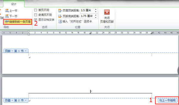 4、在有分隔符的页眉,点《页眉和页脚》工具条上的“链接到前一页”,使该页页眉右上角的出现“与上一节相同”。