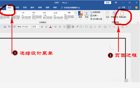 1、打开我们的word文档,然后在顶部的菜单栏找到“设计”选项菜单,再在其子菜单中找到“页面边框”选项。