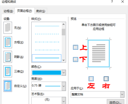 4、接着,我们为页面边框设置一个自己满意的颜色,再设置一个合适的边框宽度,如果喜欢艺术型的边框,也可以在下面“艺术型”里选择一个艺术边框。