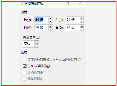 7、当然,我们还可以右下角的“选项”按钮,打开“边框和底纹”选项弹窗,来为页面边框进行更精准的设置。
