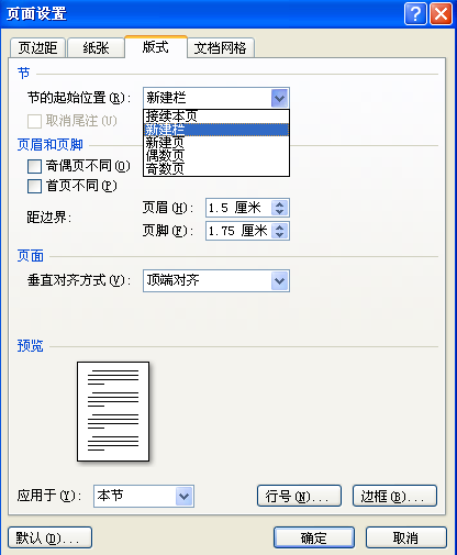 4、弹出页面设置对话框,选择版式选项卡,在节的起始位置处选择新建栏;