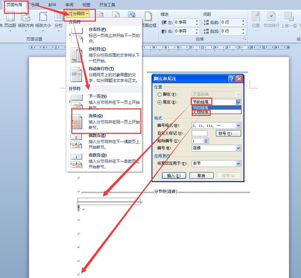 1、点击【页面布局】-【分隔符】,插入分节符。此时紧随分节符的部分就是节的结尾。