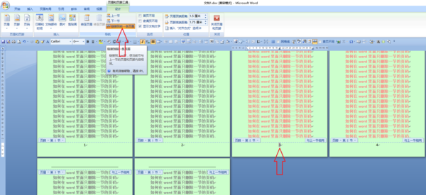 1.打开word文档,将插入点定位到需要删除的节中,双击页码,进入页脚编辑状态,单击“设计”菜单下的“链接到前一条页眉”命令,如下图: