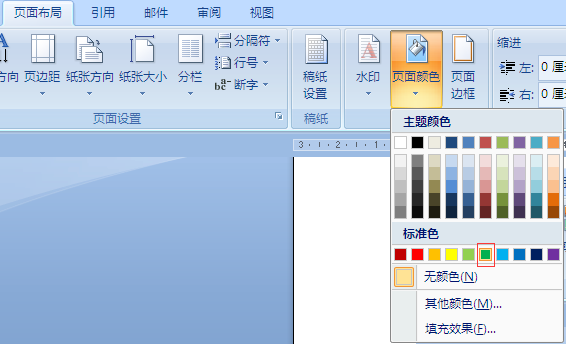 单击页面布局----页面颜色按钮,在弹出的下拉选项中选择绿色即可,如图所示。