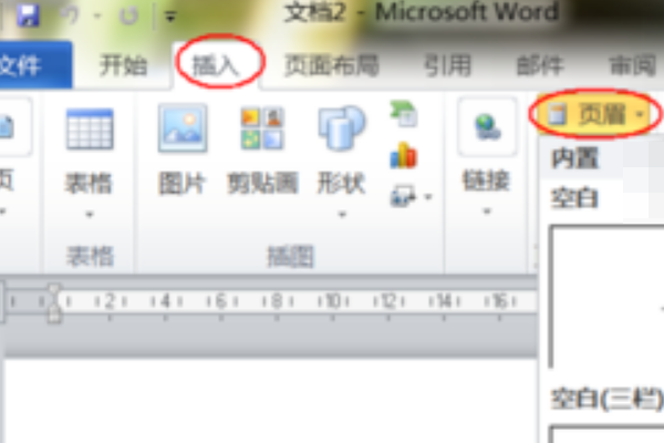 2、在打开的WORD窗口中点击“插入”选项卡,再单击“页眉”按钮,选择第一个“空白”即可: