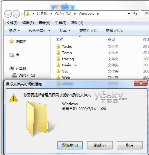 然后打开“系统所在分区—Windows”文件夹,将刚才改名的Win7桌面快捷图标拖进去。这时候系统会提示需要提供管理员使用权限,点击“继续”。