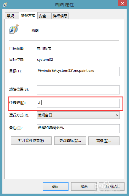 3、进入快捷键的属性,进入快捷方式页面。