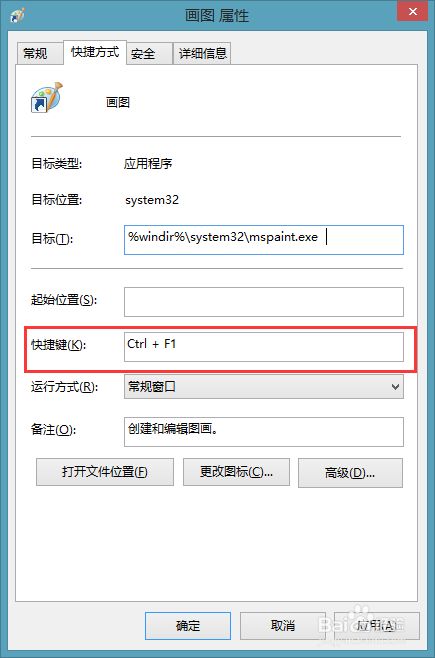 然后 在键盘上按 你指定的键盘组合。单击【确定】按钮,返回桌面按【ctrl+f1】组合键就可以快速打开画图窗口