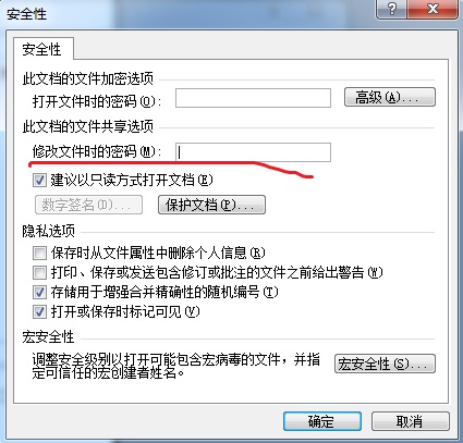 4、在“安全性”选项卡中“修改文件时的密码”中输入密码,这样就不能修改文件了。如果要屏蔽复制功能可以考虑把文档转换为PDF格式
