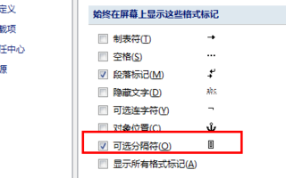 4、或者打开word文档选项,找到显示菜单--- 勾选始终显示 分隔符