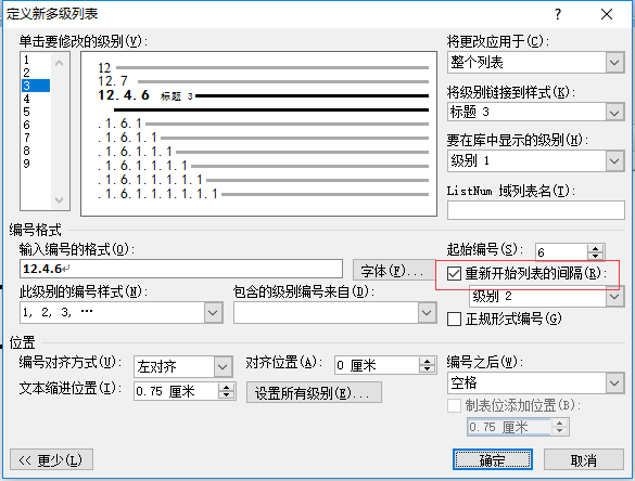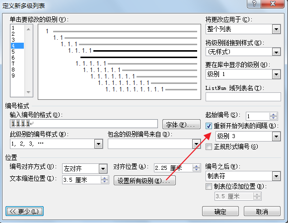 先选择要修改的级别,再设置重新开始列表的间隔为级别2即可