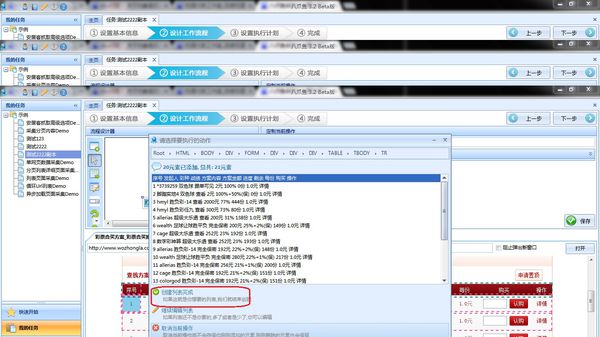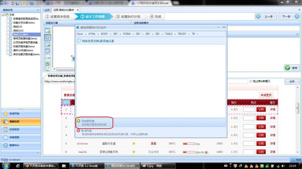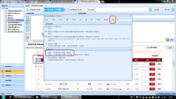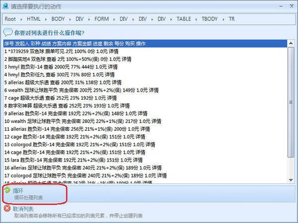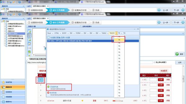 单击“点击元素”图标,在到软件下面的网页窗口里,单击“发起人”,这样会弹出一个窗口,找到顶上的“TR"标签点击,再点击“创建一个元素列表以处理一组元素”,再“添加到列表”。