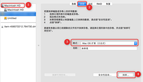 3、选择你的主硬盘(系统盘),点击“抹掉”选项卡。然后,在“格式”下拉菜单处选择Mac OS扩展(日志式),接着点击“抹掉”按钮。清除过程将开始,请耐心等待。温馨提示:如果你没有把主硬盘重命名,其默认名称是Macintosh HD。