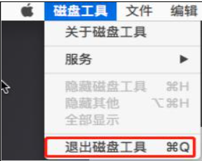 4、清除完成后,点击屏幕左上角的“磁盘工具”,再点击“退出磁盘工具”以返回macOS实用工具窗口。