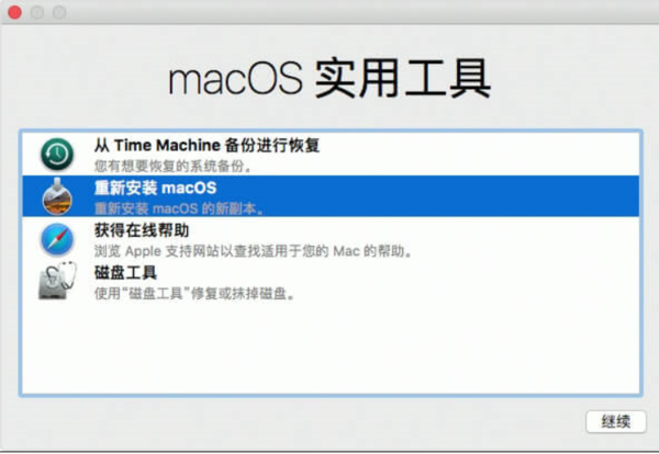 5、选择“重新安装macOS”,然后点击“继续”按钮。接着,根据屏幕指示完成选项,macOS便进入安装过程。安装完后,macbook air就恢复出厂设置完成了。