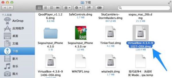首先,下载安装 Virtual Box 虚拟机,在 Finder 中的下载目录中,找到“VirtualBox-4.3.4-91027-OSX.dmg”文件,运行安装,如图所示。