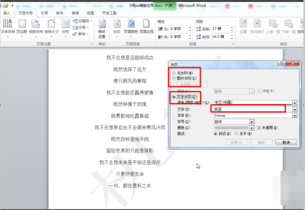2、弹出水印对话框,选择文字水印,在文字处输入机密,其它的可根据实际要求进入设置,如下图所示;