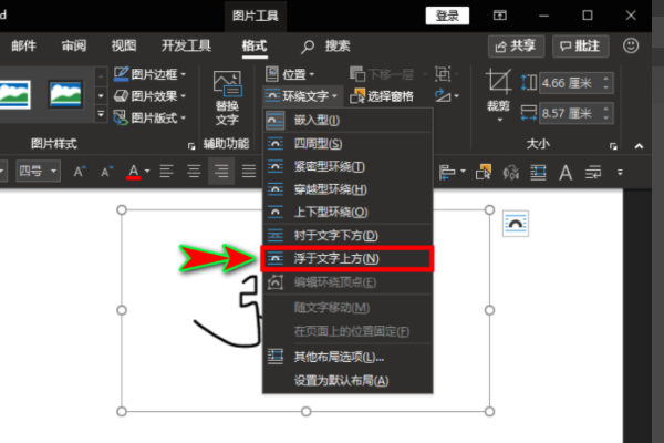 6、在“环绕文字”选项旁边点击小三角打开其下拉菜单,选中下拉菜单选项中的“浮于文字上方”选项。