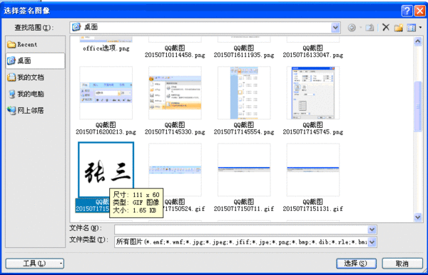 8、弹出选择签名图像对话框,选择所需要的图片即可,如图所示。