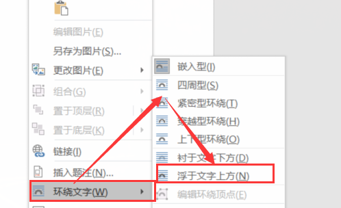 3、接着点击鼠标右键,将“环绕文字”改成“浮于文字上方”。