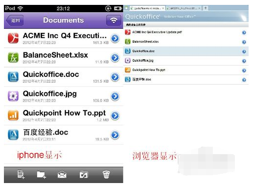 接着打开QuickOffice,首先会出现左边窗口,下面有一个电脑登陆管理的地址,这个是iphone与电脑传输文件的窗口。前提条件是iphone必须打开WIFI的功能,并与电脑同属于一个局域网里。
