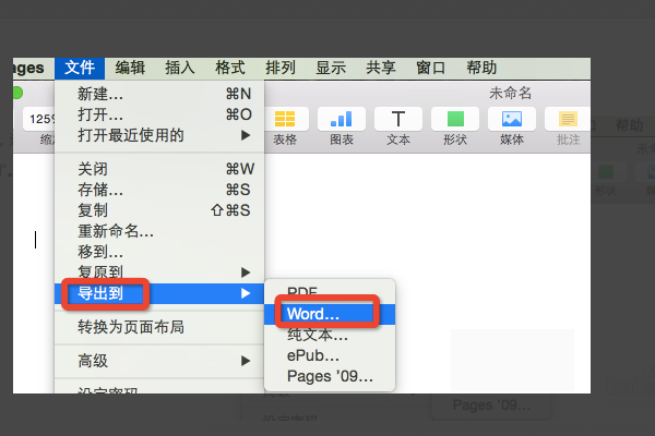 1、第一步,打开pages,建立文档,选择导航栏上“文件”-“导出到”-“word”。