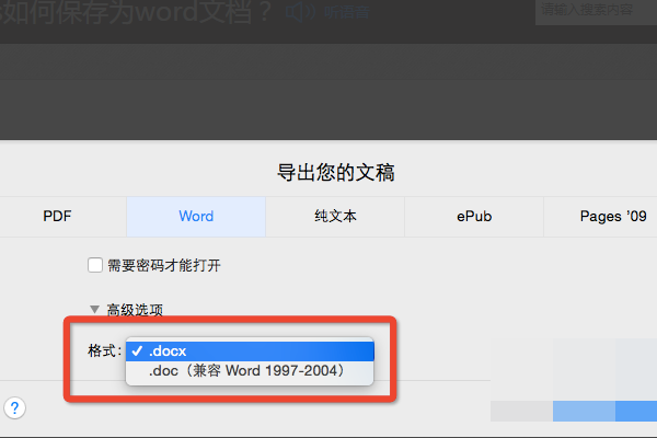 2、第二步,导出文稿,选择:word-高级选项-格式(doc,docx)-下一步。注意:doc兼容word1997-2004