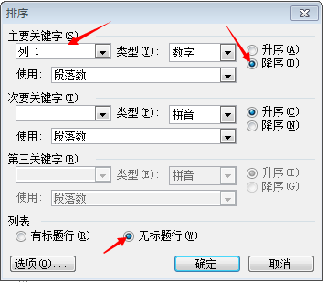 2、选择排序依据“主要关键字”,升序还是降序,有无标题行等。