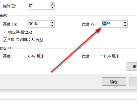 5、在随后弹出的对话框中勾选“锁定宽高比”,并将宽度和高度改为30%,随后点击确定即可。