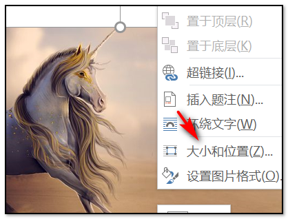 4、成功插入图片以后,在右击鼠标点击下拉选项中的“大小和位置”的命令;
