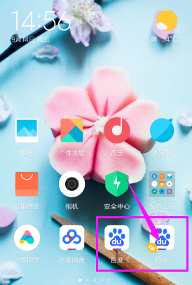 4、可以看到桌面上有两个百度app,左下角有黄色图标的就是双开生成的,我们可以在双开的图标中登录另外一个账号。