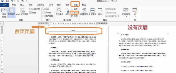 3.切换到视图---多页来看看效果,从下图可以看到只首页显示页眉。