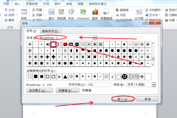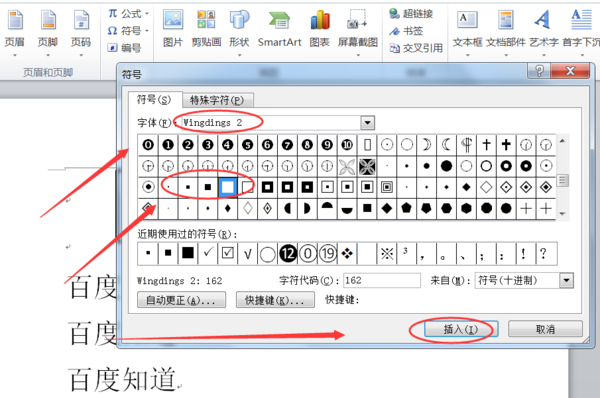 2、在字体后面选择框中选择“Wingdings 2”,可在下面符号选项中找到黑色的小方块,选择一 个插入的方块样式,然后点击“插入”按钮即可。