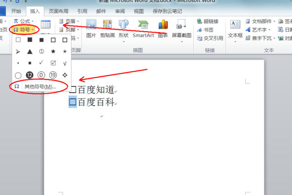 1、打开需要操作的WORD文档,在需要插入黑色小方块的地方点击插入工具栏中的“符号”,并在其下拉选项中点击“其他符号”。