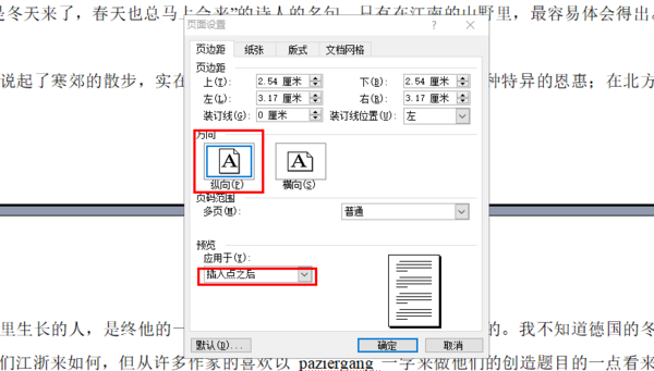 在“方向”里选择需要的特定的纵向或者横向后,再在下面的“预览”下的“应用于”里选择“插入点之后”,最后点击“确定”即可。