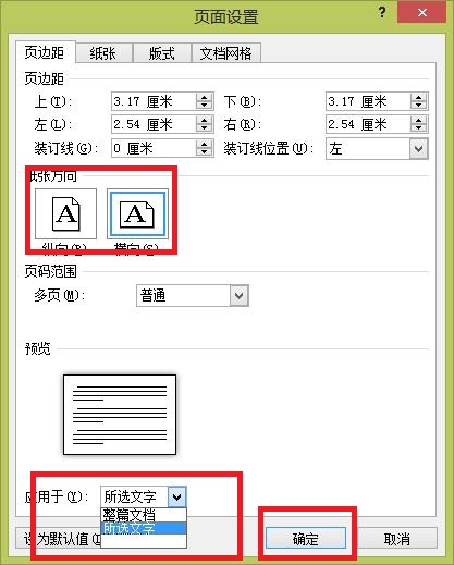 2.在“页面设置”对话框,切换至“页边距”选项卡,单击“横向”,并在“应用于”框中,单击“所选文字”
