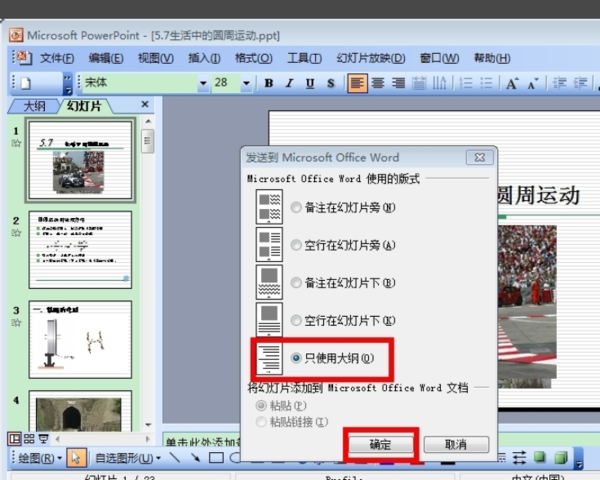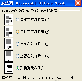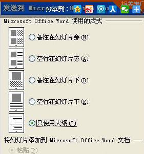 若转换时不需要幻灯片里面的图片,可以直接选择最后一项,“只使用大纲”然后确定,此时,PPT幻灯片就可以直接转换到Word2003文档中了。