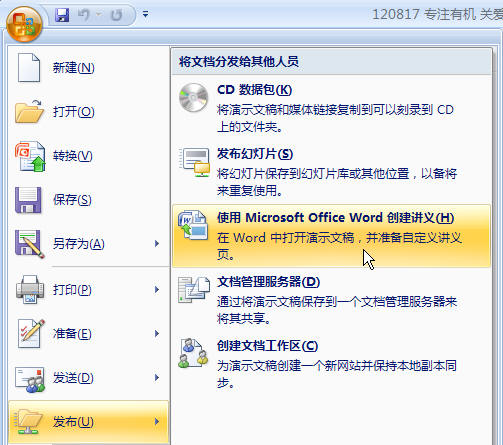 点击左上角office徽标,在弹出菜单中点击“发布”——“使用MicrosoftOfficeWord创建讲义”。其余步骤与03版相同。