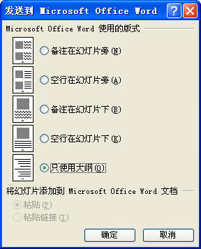 打开“发送到Microsoft Office Word”对话框后,勾选上”只使用大纲“选项,单击确定即可