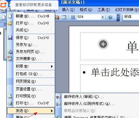 1首先打开PowerPoint选择“文件”-->发送-->Microsoft Office Word,打开。