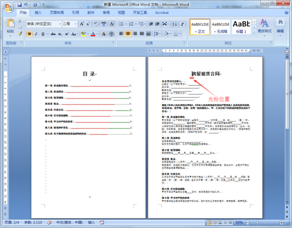 1、打开word文档,将光标移动到目录后一页的起始位置,如下图所示。