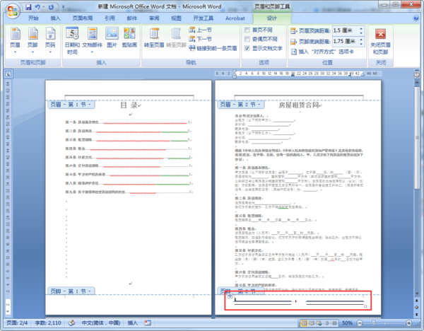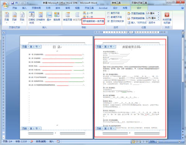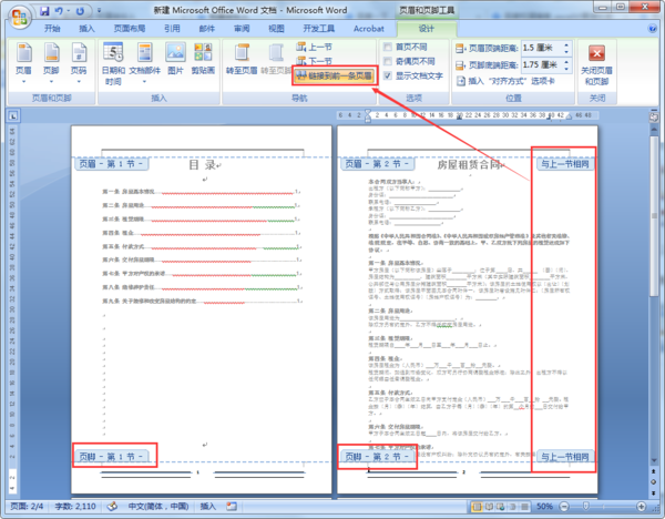5、插入页脚后我们可以看到目录为第1节,正文为第2节,然后因为页眉页脚均为链接到前一条页眉,所以页码编码是从目录页开始编码。