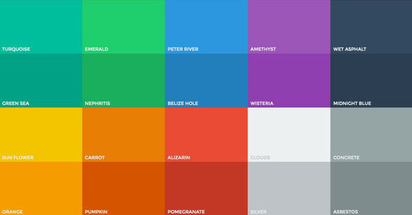 扁平化设计中,配色貌似是最重要的一环,扁平化设计通常采用比其他风格更明亮更炫丽的颜色。同时,扁平化设计中的配色还意味着更多的色调。比如,其他设计最多只包含两三种主要颜色,但是扁平化设计中会平均使用六到八种颜色。另外还有一些颜色也挺受欢迎,如复古色浅橙、紫色、绿色、蓝色等。