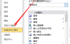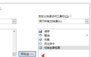 2、弹出“Word选项”对话框,在左侧的下拉列表中选择“不在功能区中的命令”,拖动滚动条选择“切换全屏视图”命令,单击“添加”按钮将其添加到右侧区域中。
