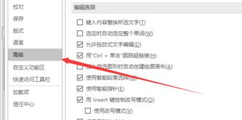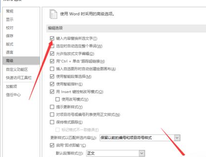 6、在“高级”选项卡栏的右侧窗格中,找到“编辑选项”区域下的“键入内容替换所选文字”选项,并将其勾选即可。如图所示;